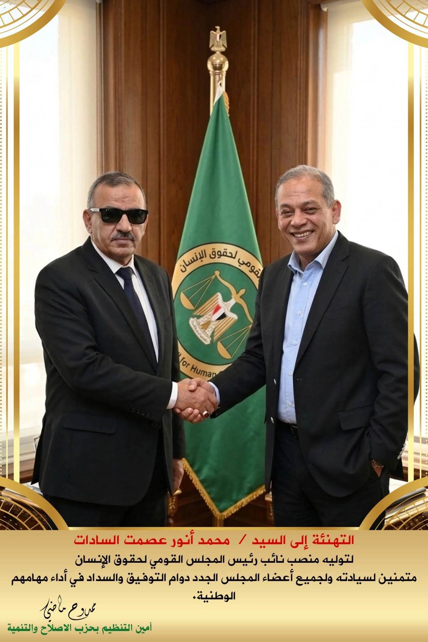 ممدوح ماضي أمين التنظيم حزب الإصلاح والتنمية يهنئ محمد أنور عصمت السادات بتوليه نائب رئيس المجلس القومي لحقوق الإنسان