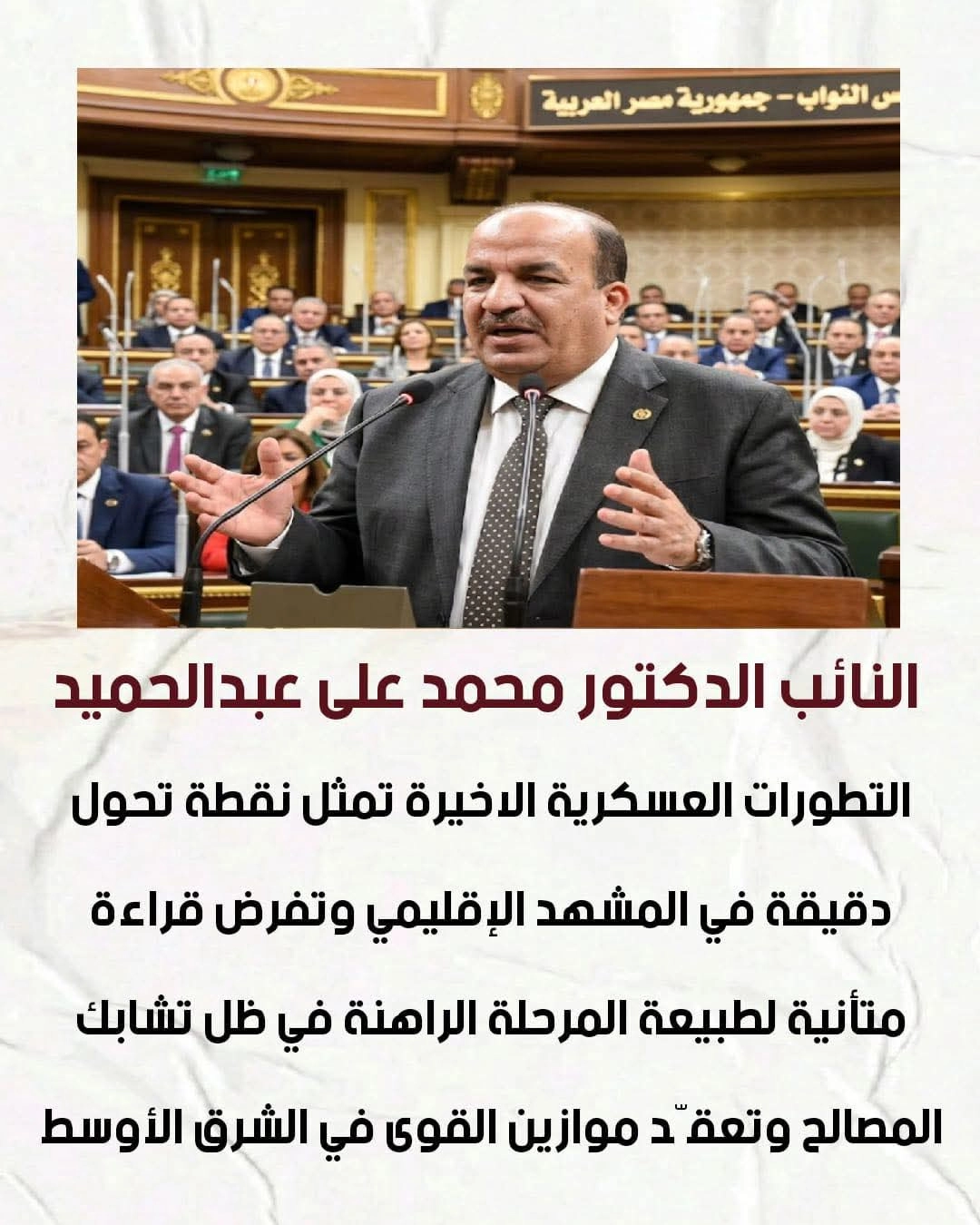 النائب د. محمد علي عبدالحميد: التطورات العسكرية الأخيرة تمثل نقطة تحول دقيقة في المشهد الإقليمي
