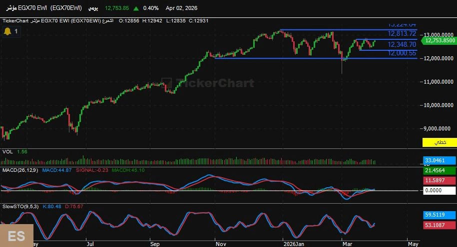 التحليل الفني لـمؤشر EGX70 .. اختراق 12,800 نقطة قد يدفع المؤشر نحو 13224نقطة