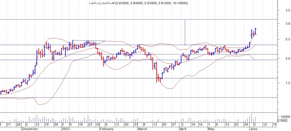 الرؤية الفنية : استطاع السهم اختراق مستوى المقاومة 2.8 وأغلق عند 2.81 جنيه نتوقع استمرارالسهم فى الصعود للمستهدف 3.1 مع تفعيل نظام حماية الارباح مع استمرار الصعود