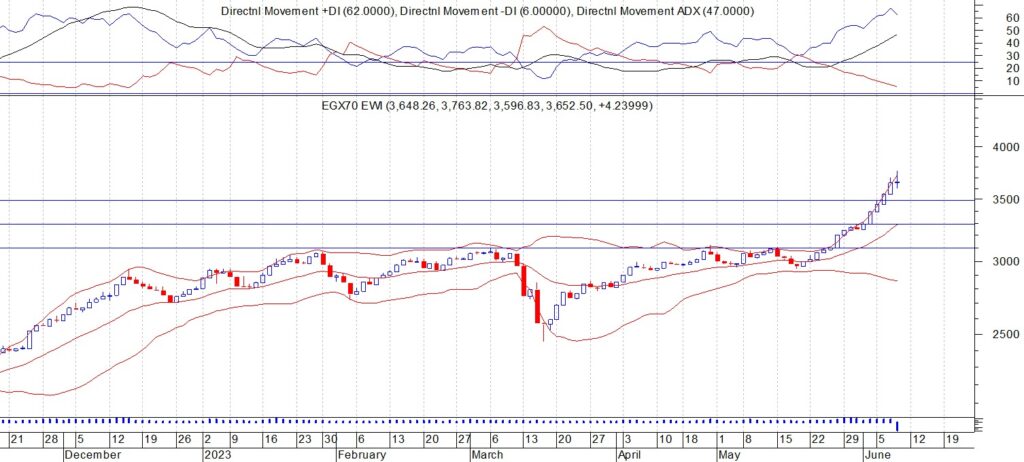 وصل مؤشر ايجي اكس 70 “مؤشر الشركات المتوسطه والصغيره”، اداؤه القوي وذلك خلال جلسات الاسبوع ليستمر الارتفاع للجلسه السابعه على التوالي حيث افتتح المؤشر جلسات الاسبوع عند مستوى 3289 نقطه واستمر في الارتفاع ليصل الى مستوى 3763 نقطه وذلك خلال جلسه الخميس .