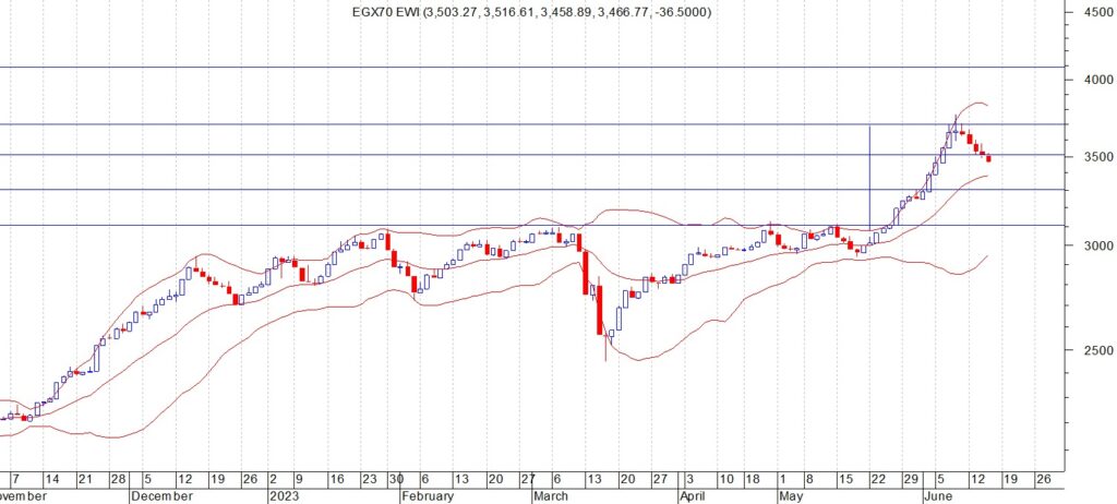 قال حازم عثمان، رئيس قسم البحوث والتحليل الفني بشركة “أونست” لتداول الأوراق المالية، فى تحليله الفني لآداء مؤشر “EGX 70” للاسهم الصغيرة والمتوسطة، إن المؤشر اغلق بنهاية تعاملات الاسبوع المنتهي، عند مستوى 3466 نقطة بعد ما حقق مستهدف الاجل القصير عند 3700 نقطة الاسبوع الماضي وكما توقعنا في تقريرنا السابق حدثت عمليات جني ارباح خلال هذا الاسبوع وكسر مستوى الدعم عند 3500 نقطه ونتوقع ان يستمر المؤشر في الهبوط ليستهدف مستوى 3300 نقطه التى نتوقع ان يبدا الارتداد منها لاعلى.