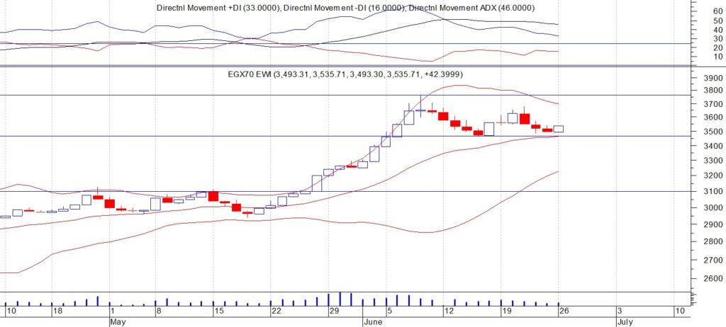 وأشار حازم عثمان فى تحليله، إلى ان المؤشر “ايجي اكس 70” اغلق عند مستوى 3535 نقطة لدى تعاملات الاسبوع الماضي، ويقف المؤشر فوق نقطة دعم هام 3450 نقطة، اذا استطاع الثبات فوقه فانه يستهدف مستويات 3750 – 3900 نقطة، والا فالدعوم 3300 – 3100 نقطة .