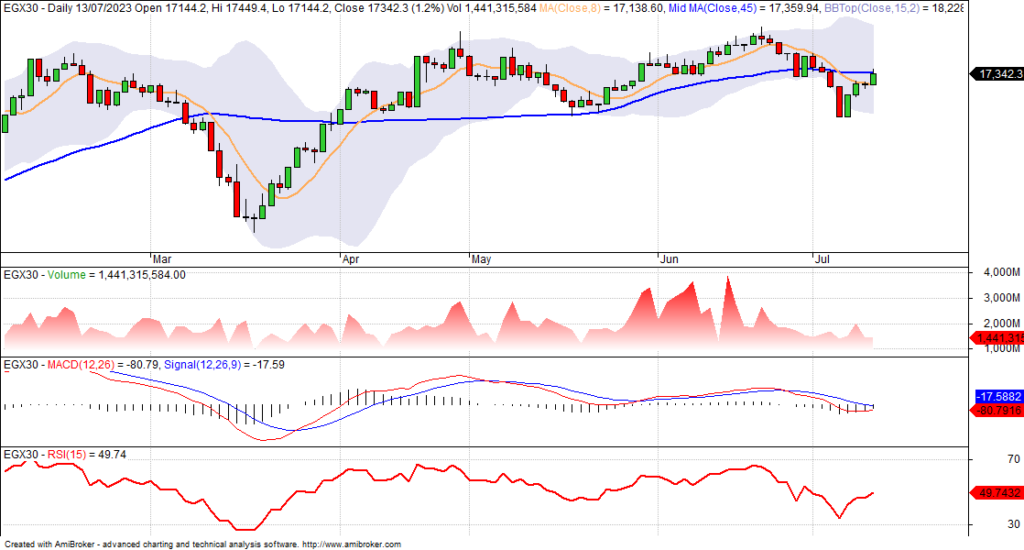 قال سامح غريب مدير قسم كبار العملاء فى شركة “عربية أون لاين” لتداول الأوراق المالية، فى تحليله لآداء مؤشر السوق الرئيسي”ايجي اكس30″، انه وبعد وصول المؤشر لمستوى الدعم 16650 نقطة، إستطاع الإرتداد لأعلى هذا المستوى بعد ظهور القوى الشرائية عند هذا المستوى، لينهى المؤشر التعاملات عند مستوى المقاومة 17500 نقطة.