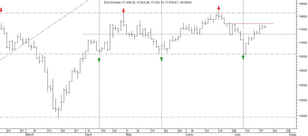 قال محمد اسماعيل مدير اداره التحليل الفنى بشركة سيجما لتداول الاوراق الماليه فى تحليله الفني عن آداء مؤشر السوق الرئيسي “ايجي اكس 30″، شهد المؤشر الرئيسي ارتفاع ملحوظ من الحد السفلي للاتجاه العرضي والذي يكمن عند منطقة الدعم 16,600 نقطة، حيث ظهرت عنده القوة الشرائية ودفعت المؤشر لأعلى ويختبر الأن مستوى المقاومة الثانوي 17,700 نقطة، والذي يجب ان يتم اختراقه لأعلى حتى يستطيع المؤشر ان يستمر في الارتفاع ليعيد اختبار الحد العلوي حول منطقة المقاومة الرئيسية 18,200 نقطة مرة أخرى، بينما في حال اي انخفاض تصحيحي مؤقت فنتوقع ان لا يتعدي منطقة الدعم 17,200 نقطة، وستظل الرؤية إيجابية قائمة طالما نتداول أعلى مستوى الدعم.