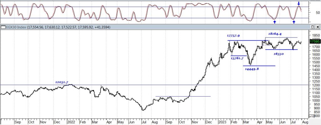 أما على المدى القصير الاجل فنجد أن هناك توازن بين القوى الشرائية والبيعية ما أدى إلى دخول المؤشر فى اتجاه عرضى على المدى القصير حده العلوى مستوى 18250 نقطة وحده السفلى 16550 نقطة، وننصح المستثمر قصير الاجل بالمتاجرة بين الحدود السعرية .
