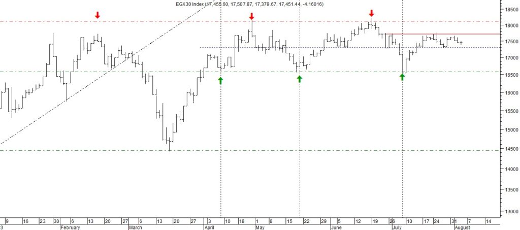 قال محمد اسماعيل رئيس قسم البحوث الفنية فى شركة “سيجما” لتداول الأوراق المالية فى تحليله الفني لمؤشر السوق الرئيسي “ايجي اكس30″، مازال المؤشر الثلاثيني يتحرك في اتجاه عرضي، كما نلاحظ النطاق الذي يسير فيه أصبح أقل كثيرا مما سبق، وننصح بالتركيز على مستوى المقاومة 17,700 نقطة، والذي يمثل بوابة الارتفاع على المدى القريب حيث في حال اختراقه لأعلى سوف يدفع المؤشر لمزيد من الارتفاع نحو قمته الرئيسية 18,200 نقطة على الأقل مرة أخرى، وستظل رؤيتنا الفنية تميل صوب الجانب الإيجابي طالما نتداول أعلى مستوى الدعم القوي 17,300 نقطة، والذي ننصح المتعاملين في السوق باتخاذه كمستوى لإيقاف الخسائر على المدى القريب .