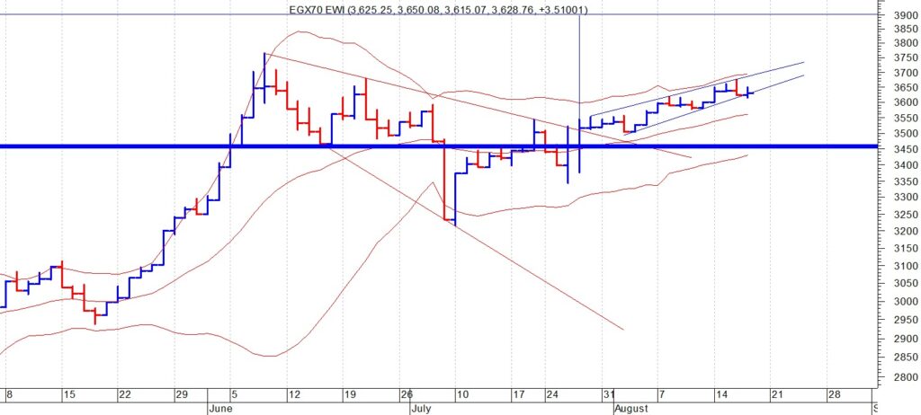 اغلق مؤشر EGX70 عند مستوى 3628 نقطه حيث استمر ارتفاع المؤشر ليصل بالقرب من مستوى المقاومه 3700 وهو مستوى مقاومه ثانوي والذي في حال اختراقه بشكل واضح لاعلى فسوف يمهد الطريق لبدء موجه سعريه صاعده لاعلى الى مستويات 3800 – 3900