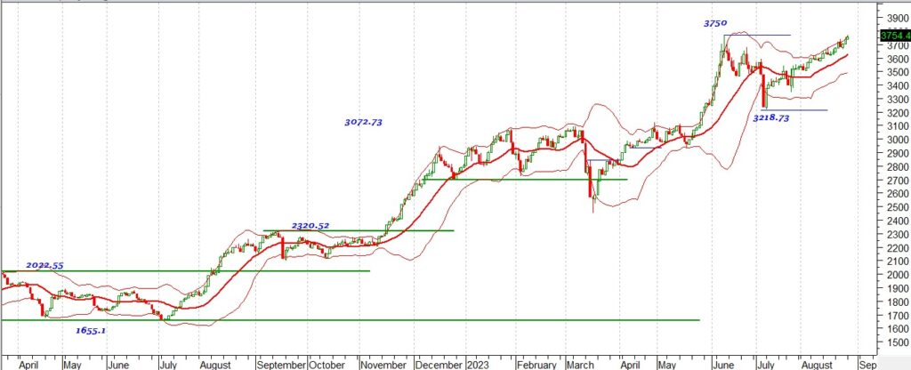 أما على المدى القصير يتحرك المؤشر فى اتجاه صاعد بعد أن ارتد من مستوى 3600 نقطة والذى أصبح مستوى الدعم الرئيسى ليستهدف مستوى 3900 نقطة كمستهدف أول على المدى القصير ،أما السيناريو البديل هو كسر مستويات 3450 نقطة لأسفل وهو مستويات الدعم الفرعية .