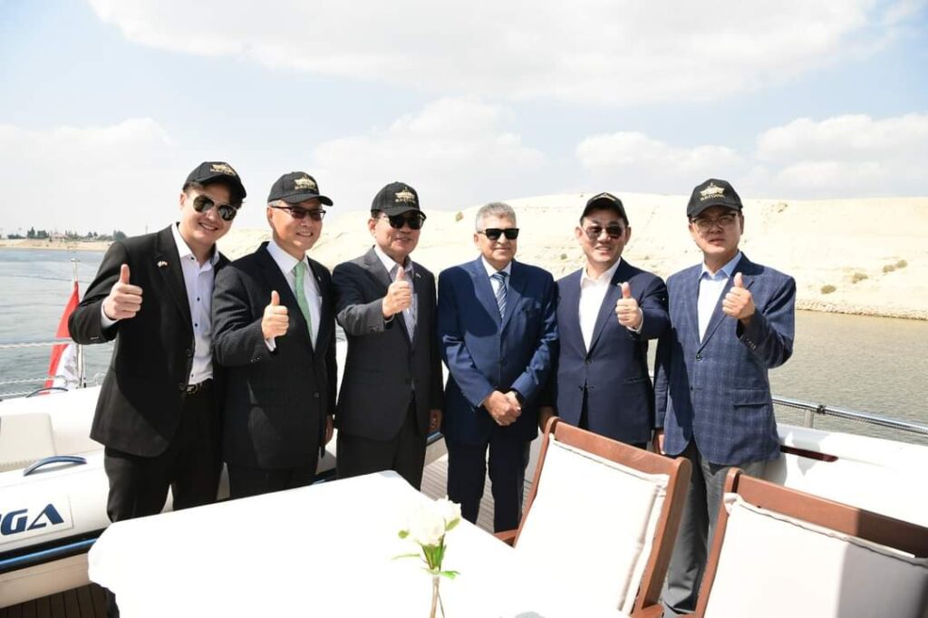 عقب ذلك، توجه الفريق أسامة ربيع والسيد كيم جين بيو رئيس الجمعية الوطنية الكورية للقيام جولة بحرية في قناة السويس الجديدة لمشاهدة حجم الإنجاز على أرض الواقع، تلاها التوجه لمبنى المارينا الجديدة.