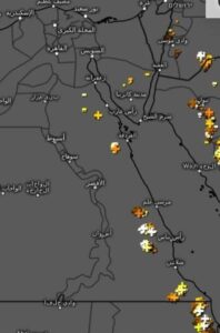 أكدت هيئة الأرصاد الجوية أنه طبقا لآخر إصدار لصور الأقمار الصناعية اليوم تظهر السحب الرعدية على مناطق من سلاسل جبال البحر الأحمر ووسط سيناء والتي يصاحبها سقوط الأمطار على فترات متقطعة والتي قد تصل لحد السيول .
