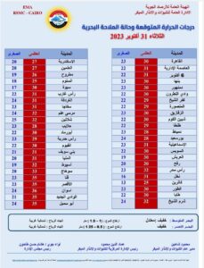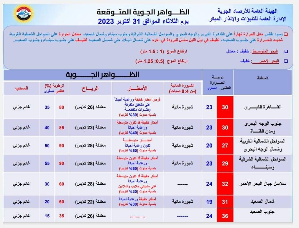 وأمطار خفيفة قد تكون متوسطة ورعدية أحيانا على مناطق من السواحل الشمالية الشرقية وسيناء ومدينتي حلايب وشلاتين ومدن القناة وجنوب الوجه البحري تمتد خفيفة ورعدية أحيانا إلى مناطق من القاهرة الكبرى وشمال الصعيد على فترات متقطعة.