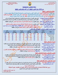 أكدت هيئة الأرصاد المصرية أن الطقس يشهد غدا الثلاثاء حالة من عدم الاستقرار والتي يصاحبها أمطار متوسطة تكون رعدية أحيانا على مناطق من السواحل الشمالية الغربية وشمال الوجه البحري على فترات متقطعة.