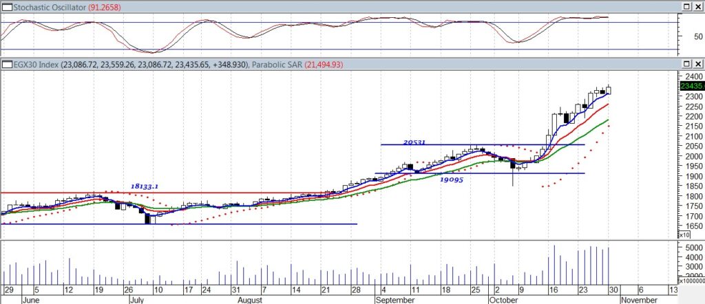 وننصح المستثمر قصير ومتوسط الأجل بإستغلال الحركات الهابطة فى الشراء بإعتبارها تصحيحات ليكون المستهدف الأول حول مستويات 23600 نقطة – 24000 نقطة على المدى القصير والمستهدف الثانى حول مستويات 25000 نقطة .