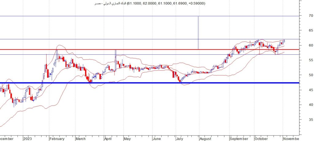 اغلق سهم التجاري الدولي اليوم عند مستوى 61.69 وكان قد وصل السهم الى مستوى 62.05 خلال الاسابيع الماضية الا انه تراجع الى مستوى 56.75 تحت الضغوط البيعية ثم استمر السهم في التحرك عرضيا بين 56.75 و 62 خلال الفترة الماضية نتوقع استمرار السهم في حركته العرضية 56.75 – 62 جنية خلال الاسبوع القادم الا انه في حال الثبات فوق مستوى 62 جنية فان التجاري الدولي يستهدف مستوى 70 جنية في الاجل المتوسط وتعتبر منطق 56.75 منطقة الدعم القريبة والمهمة للتجاري الدولي وللمؤشر العام .