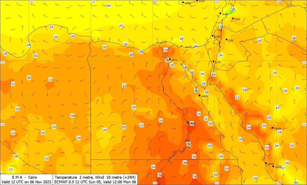 كما تسود أجواء حارة على القاهرة الكبرى والوجه البحرى والسواحل الشمالية الغربيةو شمال الصعيد وجنوب سيناء شديدة الحرارة على جنوب الصعيد.