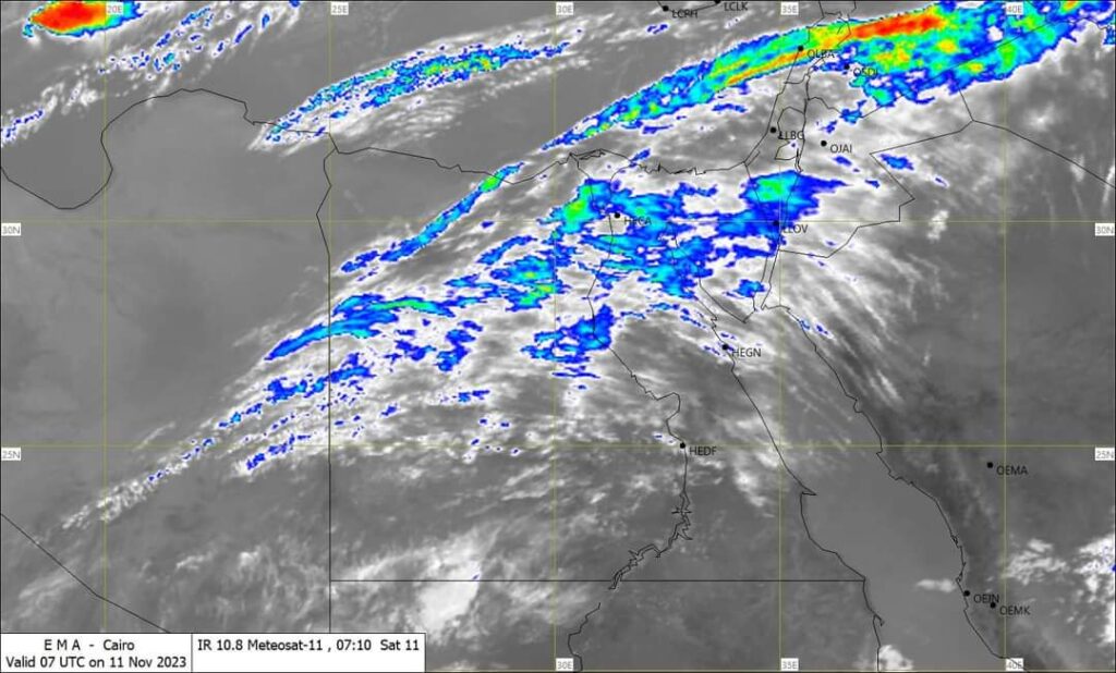 ومن المتوقع أن يصاحبه سقوط أمطار متفاوتة الشدة مع تقدم الوقت على مناطق متفرقة من الصحراء الغربية وشمال الصعيد والقاهرة الكبرى وجنوب الوجه البحرى ومدن القناه والسواحل الشمالية الشرقية ووسط سيناء تكون رعدية أحيانا .