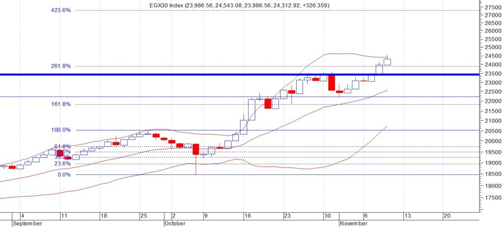 قال حازم عثمان رئيس قسم التحليل الفني فى شركة “أونست” لتداول الأوراق المالية فى تحليله الفني لمؤشر “ايجي اكس 30″، إن المؤشر الرئيسي للبورصه المصريه (EGX30) اغلق عند مستوى 24312 نقطة وكان قد وصل خلال جلسة الخميس الماضي الى اعلى قمه في تاريخه على الاطلاق عند مستوى 24543 نتوقع ان يتحرك المؤشر صعودا الى مستويات 25000 – 26000 في الاجل المتوسط ننصح باستثمار الفرصة السانحة ويجب الالتزام بنظام حماية الارباح ووقف الخسارة السريع في حال حدوث اي تقلبات بسبب الظروف الحالية وتعتبر المنطقة 23500 هي حاجز الامان للمضارب والمستثمر لا يجب اختراقها لاسفل تحت اي ضغوط بيعية لمواصلة الاتجاه العام الصاعد .