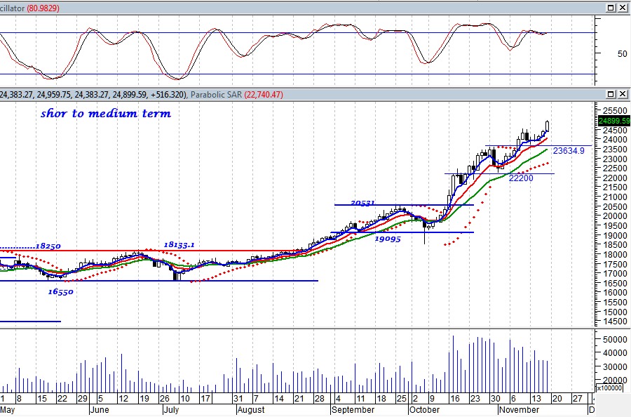 أما السيناريو البديل فى حالة كسر مستوى 23600 نقطة لأسفل يتحول اتجاه المؤشر إلى اتجاه هابط على المدى القصير ،وكسر مستوى 21000 نقطة لأسفل على المدى المتوسط ليتحول الاتجاه الى هابط .