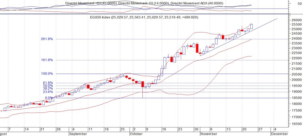 المؤشر الرئيسي للبورصه المصريه (EGX30) اغلق عند مستوى 25529 نقطة وكان قد وصل خلال الخميس الماضي الى اعلى قمه في تاريخه على الاطلاق عند مستوى 25563 نتوقع ان يتحرك المؤشر صعودا الى مستويات 26000 – 27200 في الاجل المتوسط ننصح باستثمار الفرصة السانحة ويجب الالتزام بنظام حماية الارباح ووقف الخسارة السريع في حال حدوث اي تقلبات بسبب الظروف الحالية وتعتبر المنطقة 24400 هي حاجز الامان للمضارب والمستثمر لا يجب اختراقها لاسفل تحت اي ضغوط بيعية لمواصلة الاتجاه العام الصاعد.