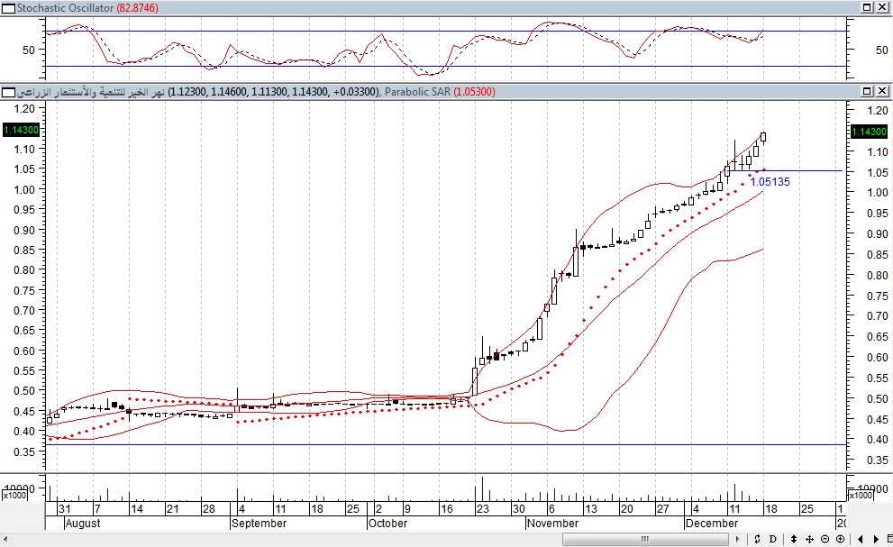 وننصح باستغلال الحركات الهابطة فى الشراء أما السيناريو البديل فى حالة كسر مستويات الدعم الرئيسية حول 1.05 جنيه لأسفل ليتحول اتجاه السهم الى هابط على المدى القصير
