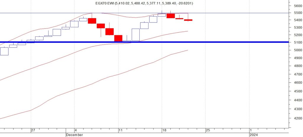 اغلق مؤشر (EGX70) عند مستوى 5389 نقطة وكان المؤشر قد حقق اعلى نقطة في تاريخه عند 5502 على الاطلاق في 12 ديسمبر الماضي ثم تعرض المؤشر لموجة صحية من جني الارباح ونزل الى مستوى 5099 فوجد دعما قويا من المتوسط المتحرك العشرين فارتد من عندها المؤشر نتوقع تحرك المؤشر عرضيا بين مستويات 5100 -5500 واذا ما استطاع اختراقها لاعلى والثبات فوقها فانه يتجه اى 5800 ثم 6000 نقطة وهو المستهدف في الاجل المتوسط ننصح بالالتزام بنظام حماية الارباح ووقف الخسارة السريع في حال حدوث اي تقلبات بسبب الظروف الحالية وتعتبر المنطقة 5100 هي حاجز الامان للمضارب والمستثمر لا يجب اختراقها لاسفل تحت اي ضغوط بيعية .