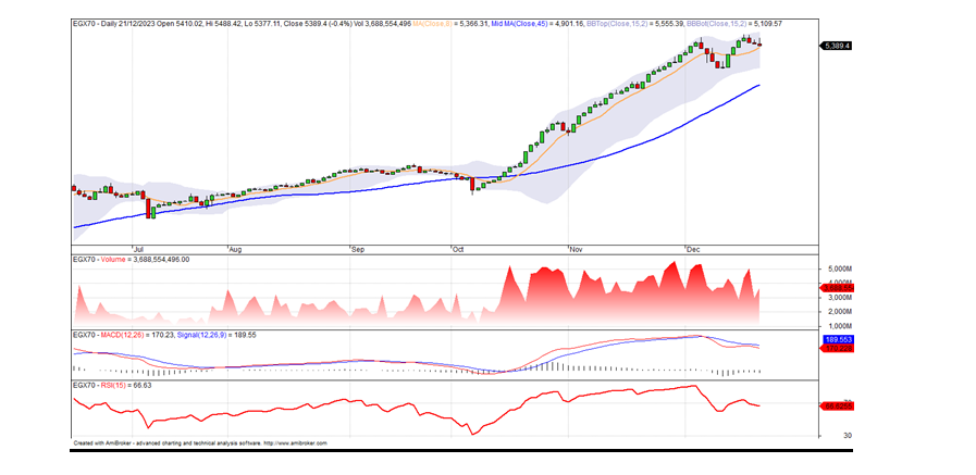قال سامح غريب رئيس قسم كبار العملاء فى شركة “عربية أون لاين” لتداول الاوراق المالية فى تحليله الفني لمؤشر الاسهم الصغيرة والمتوسطة “ايجي اكس 70″، أنهى المؤشر تعاملات الإسبوع الماضى على إرتفاع بسيط، عند مستوى 5389 نقطة، وذلك بعدما إستطاع الوصول لمستوى 5533 نقطة أثناء التداولات، وهو أعلى مستوى سعرى له، إلا أن بعض عمليات جنى الارباح دفعته للتراجع، وإستمرار تحرك المؤشر أعلى مستوى 5250 نقطة، يعنى إستمرار توقع الإرتفاع من جديد نحو مستويات 5533 نقطة ثم 5650 نقطة، ويتحرك المؤشر فى إتجاه صاعد فى المدى المتوسط والقصير.