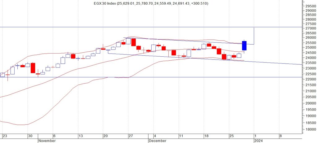 المؤشر الرئيسي للبورصه المصريه (EGX30) اغلق عند مستوى 24691 نقطة وكان قد وصل خلال الاسابيع الماضية الى اعلى قمه في تاريخه على الاطلاق عند مستوى 25945 ثم بدات موجه من جني الارباح استطاع مستوى 24300 التصدي لها نتوقع ان يتحرك المؤشر صعودا الى مستويات 25000 – 26000 واذا استطااع الثبات فوقها فانه يتجه الى 27000 ثم 28000 اما اذا لم يستطع اختراق المستوى 25300 والثبات فوقه وبدا في التراجع فستكون الدعوم على الترتيب 24300 ثم 23900 ثم 23700 ننصح باستثمار الفرصة السانحة ويجب الالتزام بنظام حماية الارباح ووقف الخسارة السريع في حال حدوث اي تقلبات بسبب الظروف الحالية وتعتبر المنطقة 23700 هي حاجز الامان للمضارب والمستثمر لا يجب اختراقها لاسفل تحت اي ضغوط بيعية لمواصلة الاتجاه العام الصاعد.