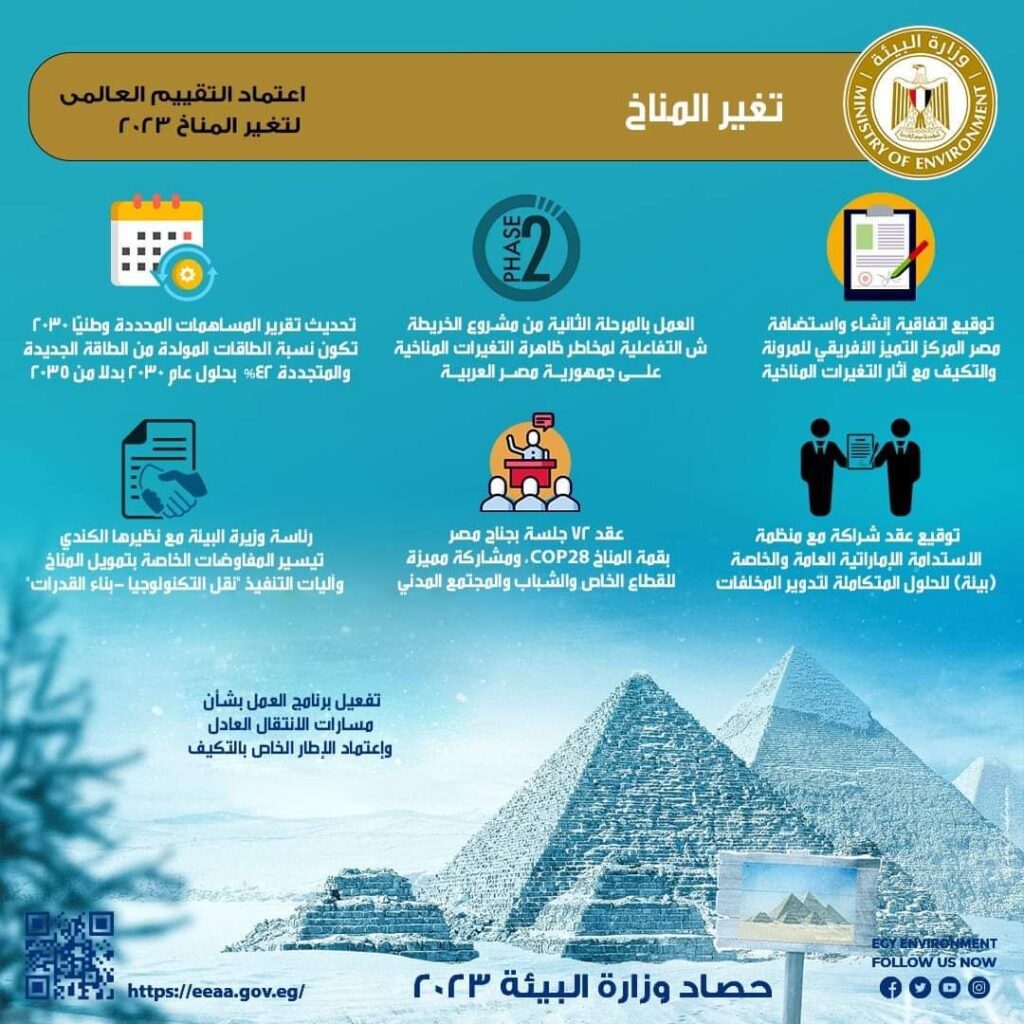 كما قامت مصر بإطلاق مشروع “صياغة وتطوير عملية خطط التكيف الوطنية في مصر (NAP)، واطلاق النسخة الأولى من التقرير القطري للمناخ والتنمية CCDR، كما تم توقيع وثيقة مشروع “تحويل الأنظمة المالية للمناخ في مصر بالتعاون مع الوكالة الفرنسية للتنمية AFD كأساس في بناء نظام تمويل المناخ في مصر وخطوة فارقة في العمل المناخي وتنفيذ الاستراتيجية الوطنية لتغير المناخ ٢٠٥٠، والتنسيق لتفعيل مبادرة أولويات التكيف للمرأة الأفريقية CAP بين وزارة البيئة والمجلس القومي للمرأة هيئة الأمم المتحدة للمرأة.