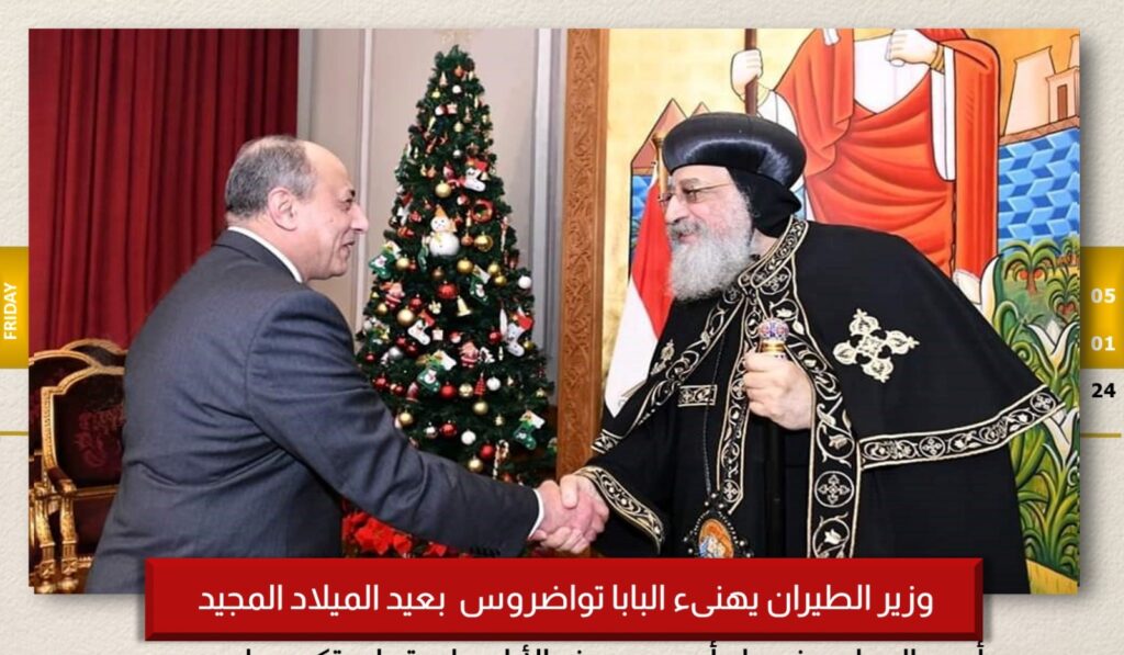 قدم الفريق محمد عباس حلمي وزير الطيران المدني التهنئة لقداسة البابا تواضروس الثاني، بابا الإسكندرية وبطريرك الكرازة المرقسية بمناسبة الاحتفال بعيد الميلاد المجيد، وذلك بمقر الكاتدرائية المرقسية بالعباسية، معربًا عن خالص تهانيه لجميع الأخوة الأقباط المصريين بعيد الميلاد المجيد، وجاءت تهنئة وزير الطيران: ” أدعو المولى عز وجل أن يعيد هذه الأيام على قداستكم وعلى جميع المصريين بالخير واليُمن والبركات، وأن يعُم السلام على مصرنا الحبيبة، وعلى العالم أجمع بالأمن والأمان وأن يمتعكم بموفور الصحة والعافية، وكل عام وقداستكم بخير»..