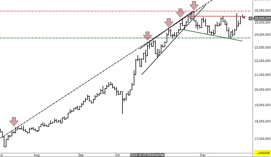مازال يتداول المؤشر الرئيسي يتحرك في اتجاه عرضي قصير الأجل، وقد أختبر الحد العلوي عند منطقة المقاومة 25,600 نقطة، والتي تمثل بوابة الارتفاع في حال اختراقها لأعلى، ولكن ظهرت القوة البيعية مرة أخرى، ويختبر الأن مستوى الدعم الثانوي 24,900 نقطة، والذي في حال كسره لأسفل سوف يمهد لمزيد من الانخفاض نحو الحد السفلي مرة أخرى حول منطقة الدعم 23,800 نقطة.