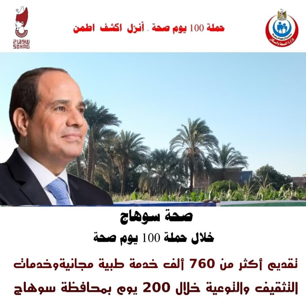 أعلن الدكتور أحمد حسن أبو هاشم وكيل وزارة الصحة بسوهاج عن تقديم 760 الف و 355 خدمة طبية وخدمات توعية وتثقيف صحي لمواطني المحافظة من خلال حملة 100 يوم صحة منذ انطلاقها يوم 25 يونيو الماضي وحتى 11 يناير من الشهر الجاري وذلك بعد توجيهات فخامة الرئيس عبد الفتاح السيسي بمد عمل الحملة