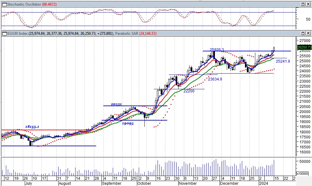 قال مصطفى رأفت ceta&cfte رئيس قسم التحليل الفنى بشركة “ميراج” لتداول الأوراق المالية فى تحليله الفني لمؤشر السوق الرئيسي “ايجي اكس 30″، نجد أن القوى الشرائية تحاول السيطرة وذلك بعد الاغلاق أعلى مستويات 25950 نقطة ليتحول اتجاه المؤشر من عرضى الى صاعد على المدى القصير لنجد أن المستهدف الأول حول مستويات 26950 نقطة والمستهدف الثانى حول مستويات 27500 نقطة