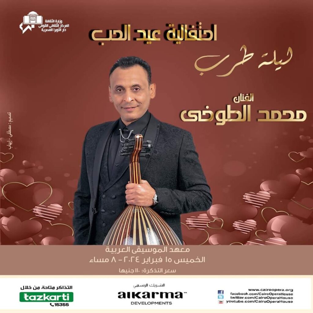 تحت عنوان “ليلة طرب”، يستعد المطرب محمد الطوخي لاحياء احتفالية عيد الحب المقرر إقامتها يوم الخميس ١٥ فبراير المقبل بمعهد الموسيقي العربية بدار الأوبرا المصرية.