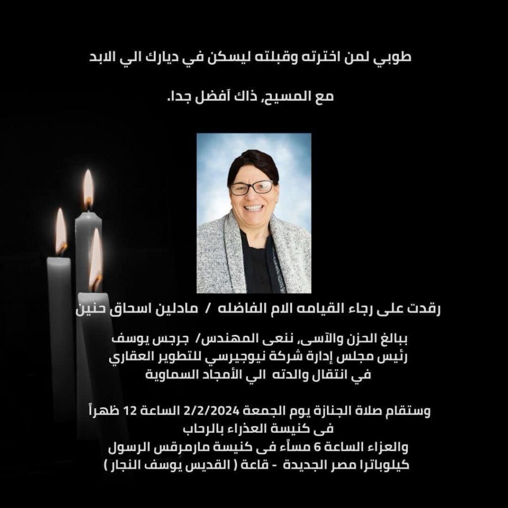 وستقام صلاة الجنازة يوم الجمعة 2/2/2024 الساعة 12 ظهرافي كنيسة العذراء بالرحابوالعزاء الساعة 6 مساء يوم الجمعة 2/2/2024 في كنيسة مار مرقس الرسول