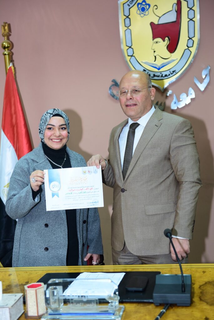 كرم الدكتور حسان النعماني رئيس جامعة سوهاج الطلاب والطالبات الفائزين في ملتقى إبداع في نسخته الخامسة لكليات التربية النوعية، والذي استضافته جامعة بنها بمشاركة ٣٥٠ طالب وطالبة يمثلون ١٠ جامعات، بحضور الدكتورة لمياء أبو زيد عميد الكلية، الدكتورة نجلاء عبدالغفار محمد مدرس المناهج وطرق التدريس بكلية التربية ورئيس البعثة، الدكتور هاني السمان مدرس الإعلام بكلية الآداب ومشرف البعثة، وذلك بقاعة مجلس الجامعة بالمقر القديم.