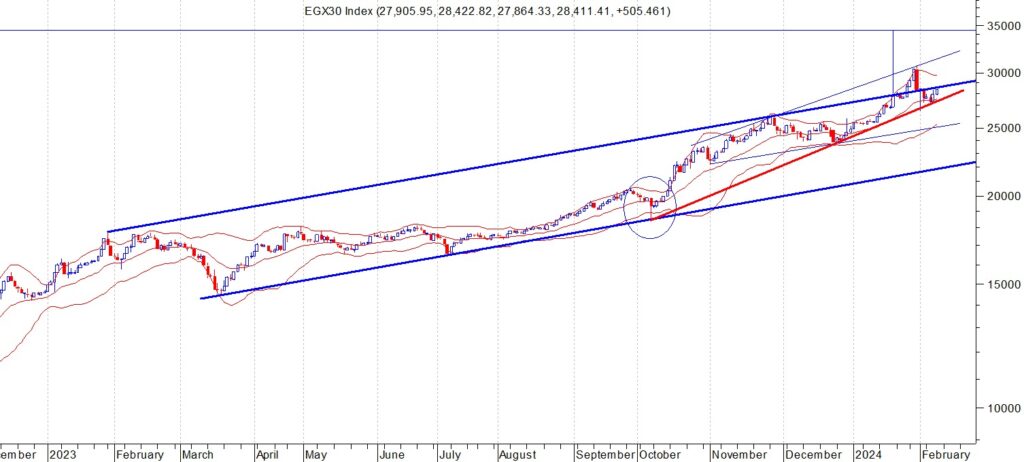 المؤشر الرئيسي للبورصه المصريه (EGX30) اغلق عند مستوى 28411 نقطة وكان قد تراجع الى مستوى 26459 ثم بدات ارتداده نتوقع ان يجد المؤشر مقاومة عند منطقة 28900 – 30100 اذا استطاع اختراقها والثبات فوقها فانه يتحرك الى مستويات 31000 – 32000 في الاجل المتوسط والا فالدعوم 28000 – 27500 – 26500 على الترتيب ننصح باستثمار الفرصة السانحة ويجب الالتزام بنظام حماية الارباح ووقف الخسارة السريع في حال حدوث اي تقلبات بسبب الظروف الحالية وتعتبر المنطقة 26500 هي حاجز الامان للمضارب والمستثمر لا يجب اختراقها لاسفل تحت اي ضغوط بيعية لمواصلة الاتجاه العام الصاعد