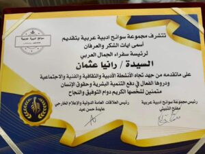 حيث عبرت رئيسة سفراء الجمال العربي أخصائية التجميل الاستاذة رانيا عثمان عن شكرها وسعادتها بهذا التكريم الذي اعتبرته وسام عربي من الدرجة الرفيعة فهذا التكريم اجتمعت فيه السعودية ومصر ولبنان وأكدت ان رسالتها في دعم المرأة مستمرة ..