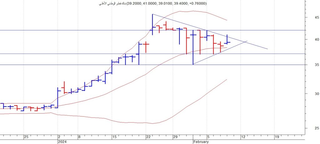 يتحرك بنك قطر الاهلي QNB بين مستويات الدعم عند 37 و مستويات المقاومة عند 42 ننصح بالمضاربة بين مستويي الدعم والمقاومة وفي حال اختراق السهم لمستوى 42 فانه يستهدف 46 ثم 50 جنية وكان السهم قد حقق اعلى سعر له على الاطلاق عند مستوى 45.74 خلا الاسابيع الماضية نتوقع ان يتحرك السهم ايجابيا خلال الفترة القادمة ننصح باستثمار الفرصة السانحة ويجب الالتزام بنظام حماية الارباح ووقف الخسارة السريع في حال حدوث اي تقلبات بسبب الظروف الحالية وتعتبر المنطقة 35 جنية هي حاجز الامان للمضارب والمستثمر لا يجب اختراقها لاسفل تحت اي ضغوط بيعية لمواصلة الاتجاه العام الصاعد .