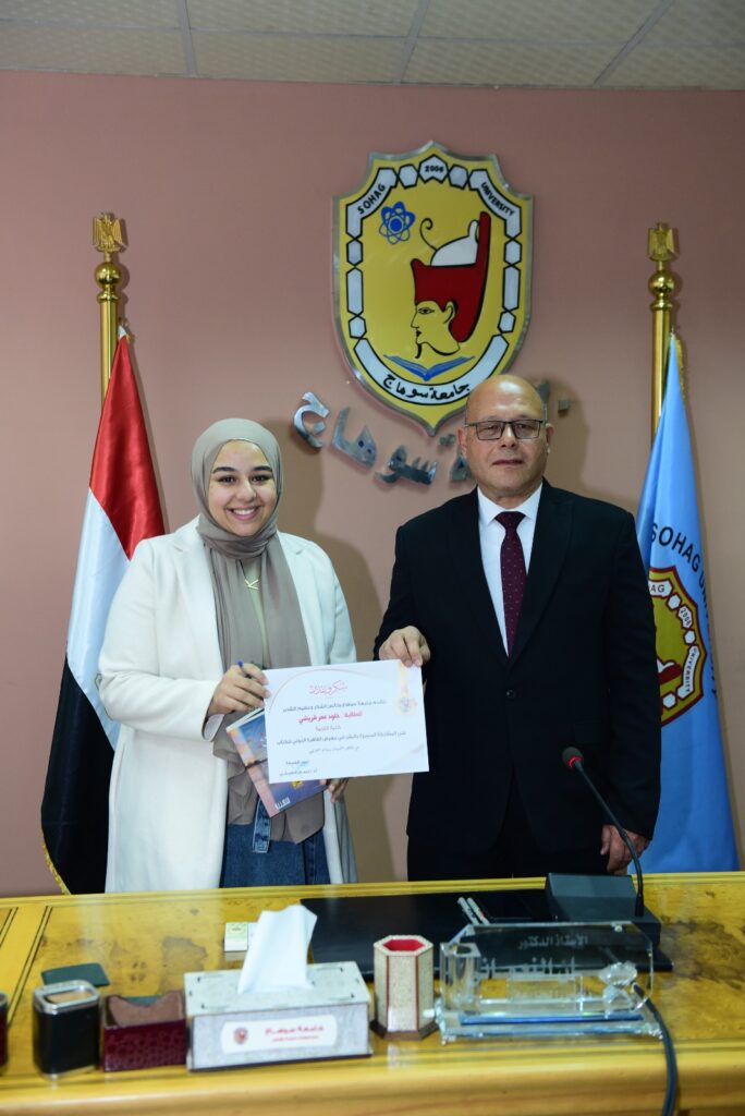 وجدير بالذكر ان المكرمبن هم كريمة الرفاعي بمكتب نائب رئيس الجامعة لشئون الدراسات العليا والبحوث، والتي شاركت بنشر كتاب بعنوان “الاقتصاد عبر المجتمع الشبكي”، والطالبة خلود عمر قريشي بالفرقة الرابعة بقسم الإعلام كلية الآداب عن نشرها كتاب بعنوان “ميزانسين”، والطالبة رحاب الهواري بالفرقة الرابعة بكلية الآداب على نشرها لرواية بعنوان “طوق النجاة”، والطالبة ياسمين أبو الفضل عبدالعزيز بالفرقة الرابعة بكلية الزراعة على نشرها لكتابين “مضاد اكتئاب” و “مر طيف”، والطالبة نوال شريف صدقي تمهيدي ماجستير قسم الفلسفة بكلية الآداب على نشرها لكتابين بعنوان “مارا” و “أميرة المورينجا”، والطالب عبدالرحمن صلاح بالفرقة الثالثة كلية الزراعة على نشرة رواية بعنوان “ميت ترانزيت”.