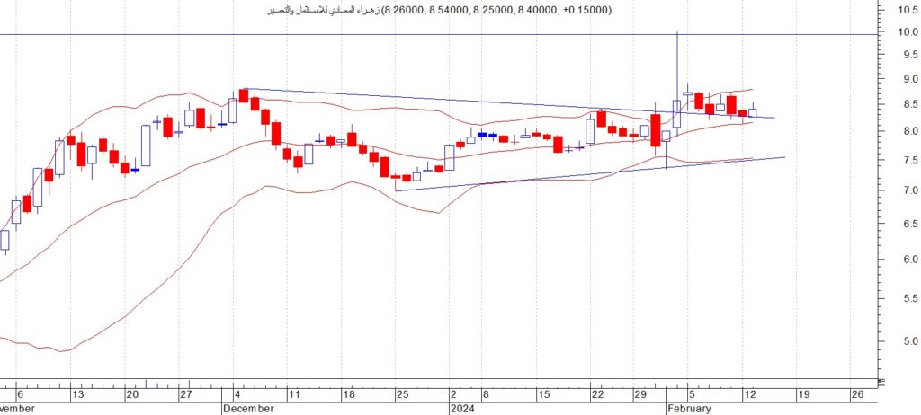 اغلق سهم زهراء المعادي عند مستوى 8.4 واستطاع السهم الخروج من المثلث المتماثل مستهدفا 10 جنية ننصح وننصح بالشراء قرب مستويات الدعوم 8.2 – 8.5 ووقف الخسارة تحت مستوى 8 جنيةويجب الالتزام بنظام حماية الارباح ووقف الخسارة السريع في حال حدوث اي تقلبات بسبب الظروف الحالية