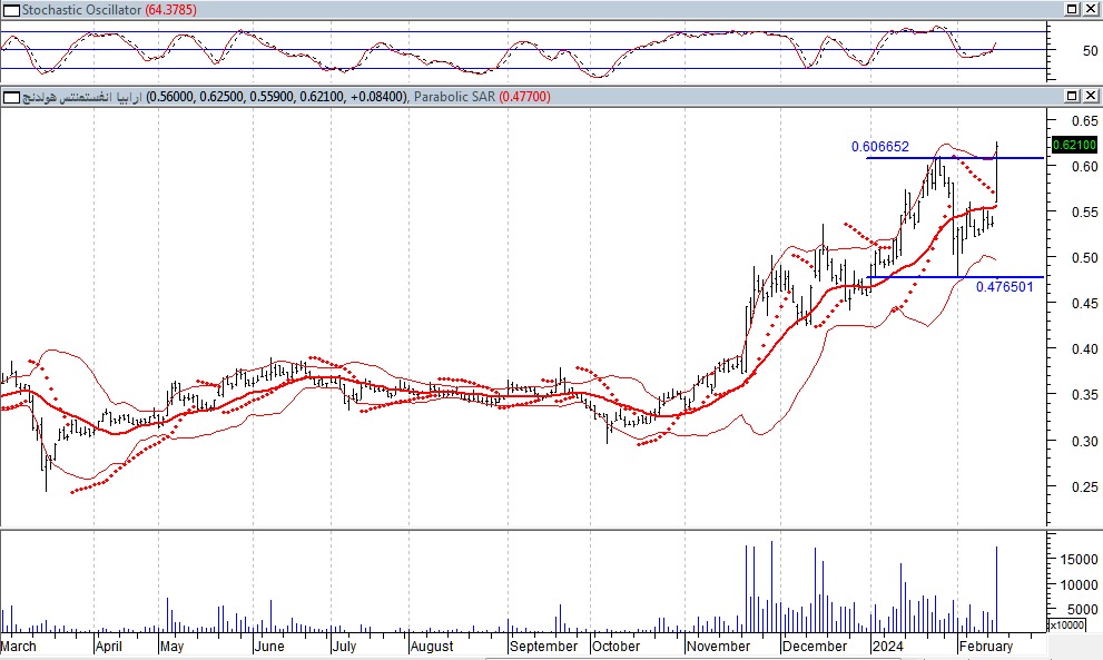 على أن يكون السيناريو البديل فى حال تراجع السهم اسفل مستويات المقاومة المخترقة 60 قرش ليتحول الاتجاه الى عرضى حده العلوى حول مستويات 62 قرش وحده السفلى حول مستوى 47 قرش