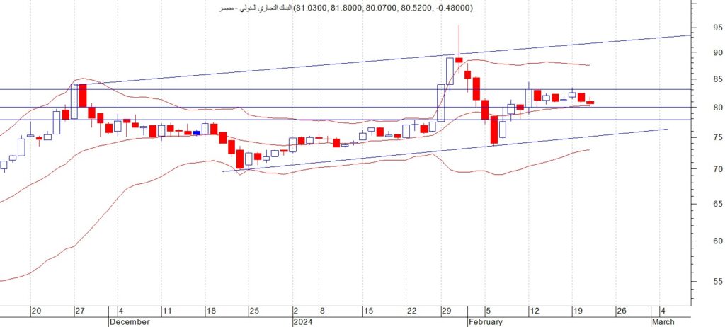 اغلق سهم التجاري الدولي عند مستوى 80.52 ويتحرك السهم عرضيا بين 80 و 83 جنية اذا استطاع السهم تجاوز مستوى 83 والثبات اعلاه فانه يتجه الى 87 ثم 92 ثم 100 جنية في الاجل المتوسط وفي حال كسر مستوى 80 فانه يتجه الى مستوى 76 جنية وهو مستوى وقف الخسارة حال الاغلاق تحته ننصح باستثمار الفرصة السانحة ويجب الالتزام بنظام حماية الارباح ووقف الخسارة السريع في حال حدوث اي تقلبات بسبب الظروف الحالية وتعتبر المنطقة 75- 76 هي حاجز الامان للمضارب والمستثمر لا يجب اختراقها لاسفل تحت اي ضغوط بيعية لمواصلة الاتجاه العام الصاعد.