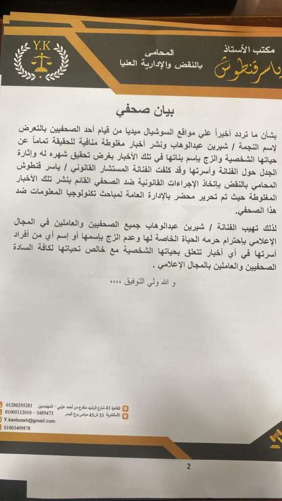 أصدرت النجمة شيرين عبد الوهاب منذ قليل بيانا صحفيا أكدت فيه أنها كلفت المستشار القانوني ياسر قنطوش المحامي بالنقض باتخاذ الأجراءات القانونية ضد احد الصحفيين بعد نشر أخبار مغلوطة منافية للحقيقة عن حياتها الشخصية، والزج باسم بناتها في تلك الاخبار بغرض تحقيق شهرة وإثارة الجدل حولها هي أسرتها.