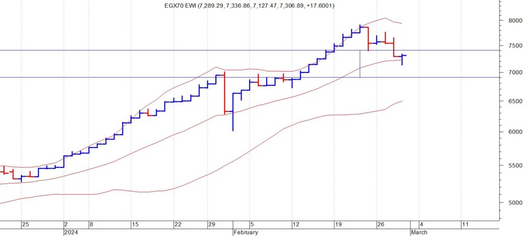 اغلق المؤشر السبعيني عند مستوى 7306 بعدما كون نموذج القمتين وكسر خط الرقبة عند مستوى 7400 نتوقع ان يجد المؤشر مقاومة عند الارتداد الى مستوى 7400 ويدفعنا ذلك الى ان نتوقع ان يتحرك المؤشر هبوطا الى مستوى 6900 وفي حال كسره يستهدف 6300 ننصح باستثمار الفرصة السانحة ويجب الالتزام بنظام حماية الارباح ووقف الخسارة السريع في حال حدوث اي تقلبات بسبب الظروف الحالية.