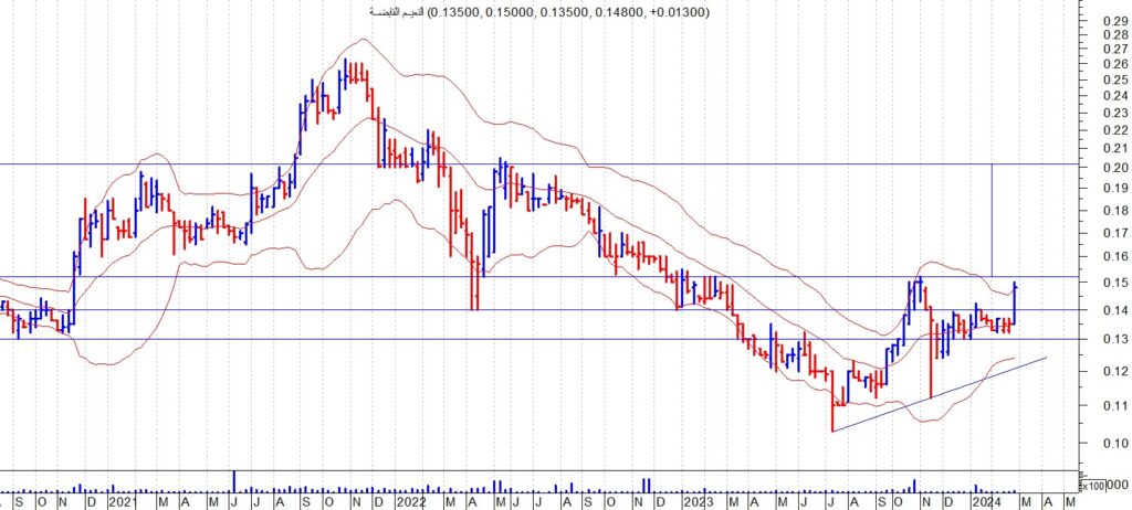 اغلق سهم النعيم القابضة ( سهم دولاري ) عند مستوى 0.145 وهو قريب من مقاومته الرئيسية عند مستوى 0.152 ونتوقع اختراق هذا المستوى لاعلى خلال هذا الاسبوع وفي حال الاستقرارا والثبات فوقه فانه يتجه الى مستوى 0.20 سنت في الاجل المتوسط ننصح باستثمار الفرصة السانحة ويجب الالتزام بنظام حماية الارباح ووقف الخسارة السريع في حال حدوث اي تقلبات بسبب الظروف الحالية وتعتبر المنطقة 0.14 هي حاجز الامان للمضارب والمستثمر لا يجب اختراقها لاسفل تحت اي ضغوط بيعية لمواصلة الاتجاه العام الصاعد .