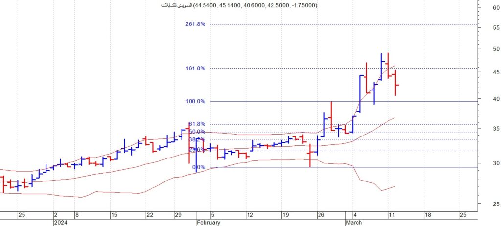 اغلق سهم السويدي عند مستوى 42.5 وهو قريب من مقاومته الرئيسية عند مستوى 47 ونتوقع اختراق هذا المستوى لاعلى خلال هذا الاسبوع وفي حال الاستقرارا والثبات فوقها فانه يتجه الى مستوى 56 ثم 72 ننصح باستثمار الفرصة السانحة ويجب الالتزام بنظام حماية الارباح ووقف الخسارة السريع في حال حدوث اي تقلبات بسبب الظروف الحالية وتعتبر المنطقة 40 هي حاجز الامان للمضارب والمستثمر لا يجب اختراقها لاسفل تحت اي ضغوط بيعية لمواصلة الاتجاه العام الصاعد .