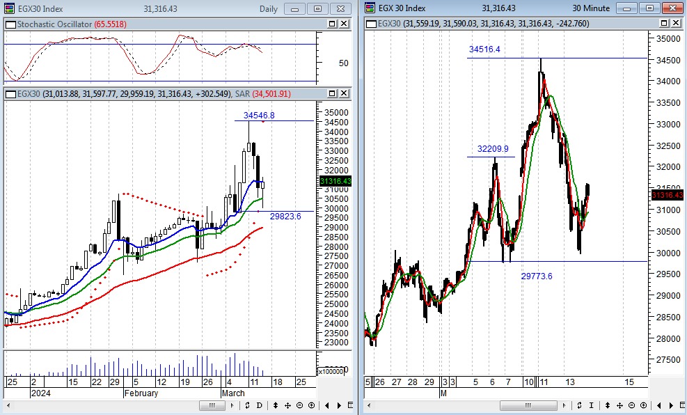هناك توازن بين القوى الشرائية والبيعية ماأدى الى تحركه فى اتجاه عرضى على المدى القصير ليكون حده السفلى حول مستويات 29500 نقطة والذى يعد مستوى الدعم الرئيسى وحده العلوى حول مستويات 34500 نقطة والذى يعد مستوى المقاومة الرئيسية له