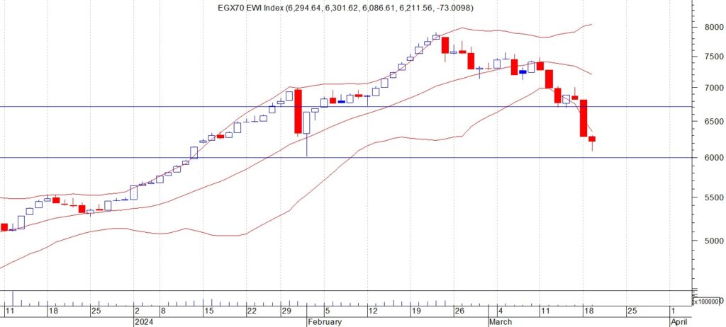 اغلق المؤشر السبعيني عند مستوى 6211 وقد تعرض المؤشر لموجه شديدة من جني الارباح افقدته منطقة ال 7100 ليحقق اقل رقم اليوم عند 6086 ثم بدا في الارتداد نتوقع ان يحاول المؤشر الارتداد الى مستوى 6500 – 6700 ثم يعاود الهبوط مرة اخرى مستهدفا 6000 نقطة نتوقع ان يستمر التارجح بين هذه المستويات وتعتبر المقاومة الرئيسية 6700 في حال اختراقها لاعلى بحجم تداول عالي والثبات فوقها فانه ستكون الاشارة لاستمرار الصعود مستهدفين 7100 نقطة وكذلك يعتبر الدعم الاهم هو المنطقة بين 6000 ثم 6200 ننصح باستثمار الفرصة السانحة ويجب الالتزام بنظام حماية الارباح ووقف الخسارة السريع في حال حدوث اي تقلبات بسبب الظروف الحالية.