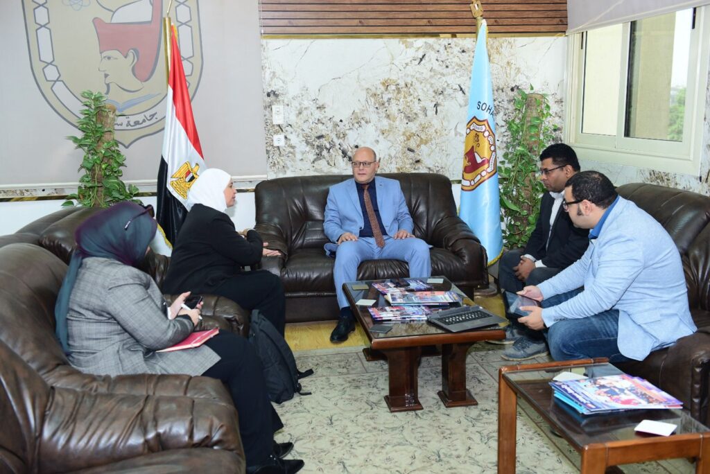 استقبل الدكتور حسان النعماني رئيس جامعة سوهاج الدكتورة أمل عبد الواحد مدير مشروع مراكز التطوير المهني بالجامعة الأمريكية، وذلك لمناقشة خطة العمل المستقبلية لمركز التطوير المهني بالجامعة، بحضور الدكتور خالد عمران نائب رئيس الجامعة لشئون خدمة المجتمع و وتنمية البيئة، الدكتور سيد جبريل مدير المركز، والدكتور عمرو نصار نائب مدير المركز.